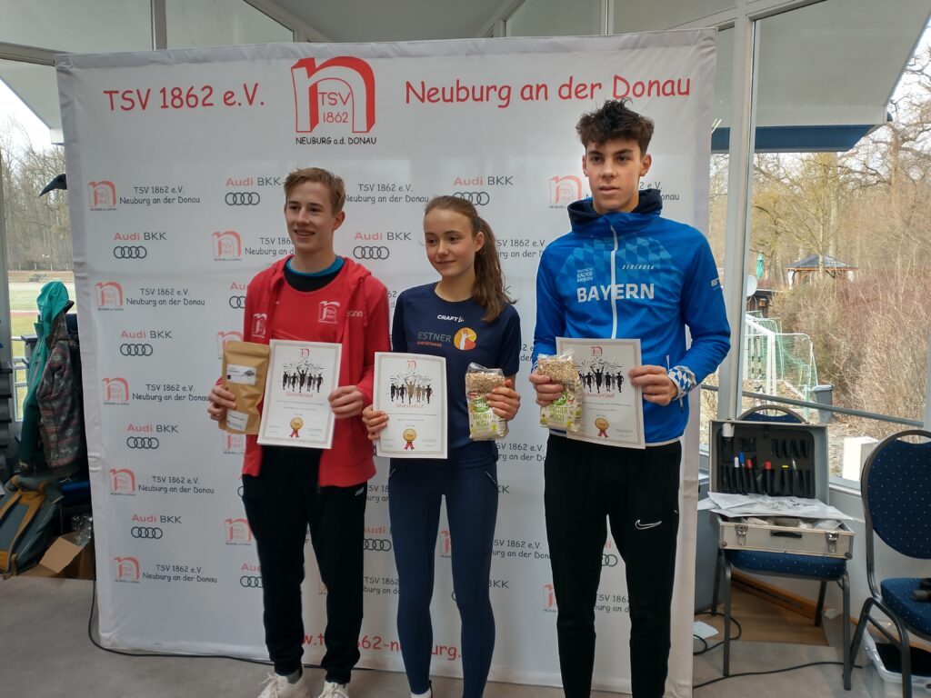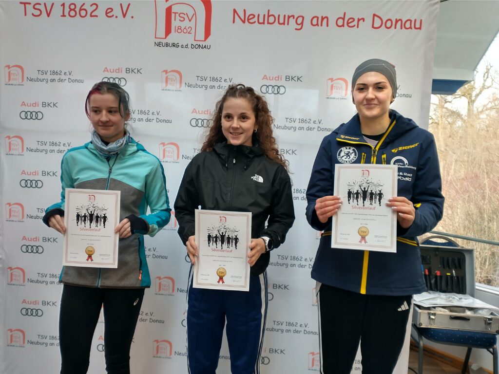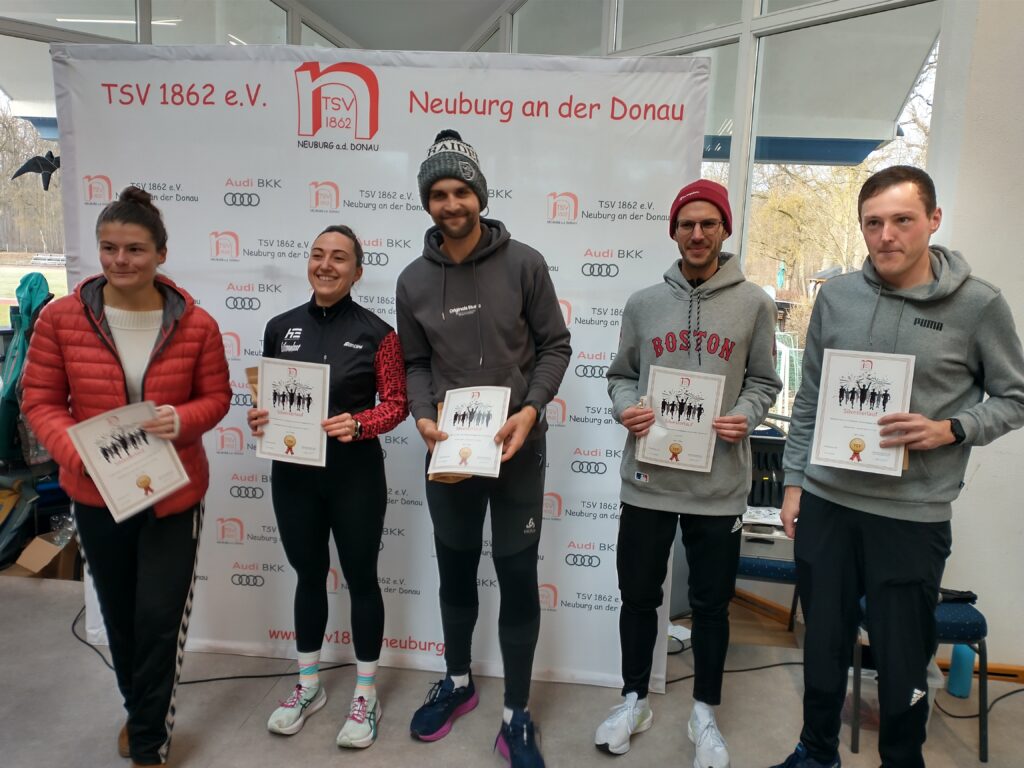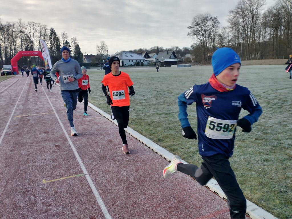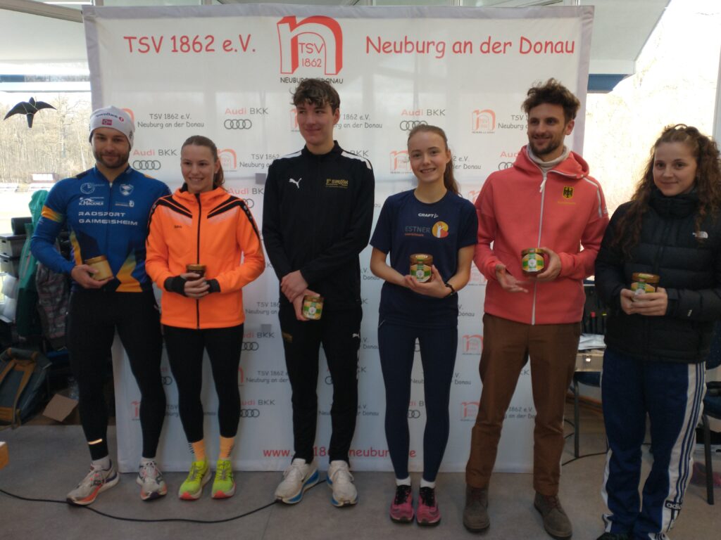 Oberbürgermeister Dr. Bernhard Gmehling schoss dann pünktlich das Läuferfeld auf die Strecke zum letzten Mal in der Funktion des Stadtoberhauptes. Lange Zeit bildete ein Quartett um Moritz Gutowski (LG Stadtwerke München), Basti Glockshuber (TSV Neuburg), Johannes Stahr (TSV Gaimersheim) und Luca Schreitmüller (TSV Harburg) die Spitze, aus der sich dann der 18jährige Gutowski als Vorjahressieger nach drei gelaufenen Kilometern mit einer Zeit von 19.04 Minuten gegen Glockshuber (19.22 Minuten), Stahr (19.37 Minuten) und den 17jährigen Schreitmüller (19.47 Minuten) durchsetzen konnte. Unser Vinzenz Fortner konnte die ersten zwei Kilometer bei der Männerspitze mithalten, dann musste der Mittelstreckenspezialist das Tempo etwas herausnehmen. Bei den Frauen war der Weg frei für die 16jährige Anita Blersch (21.56 Minuten, TSV Brannenburg), die auf Cross- und Hindernisstrecken zuhause ist, vor der 18jährigen Cosima Adam (22.47 Minuten) und Vorjahressiegerin Anna Liepold (22.54 Minuten, SC Irgertsheim). Wie im Vorjahr dominiert mittlerweile die Jugend das Geschehen, denn bei der Frauen- und Männerspitze mischen immerhin vier leistungsstarke Läufer mit. So muss es sein. Unisono kommentierten die Sieger die Veranstaltung mit „es hat Spaß gemacht“ und „ein guter Jahresabschluss“.