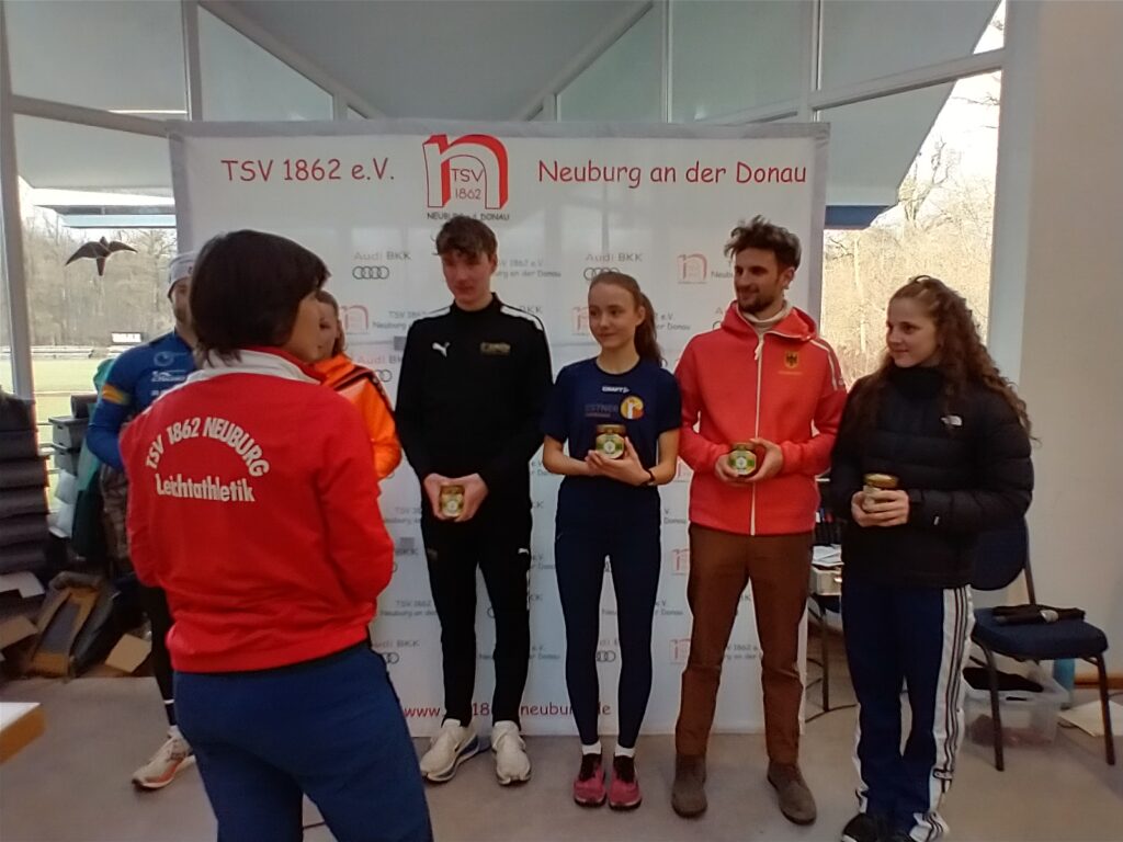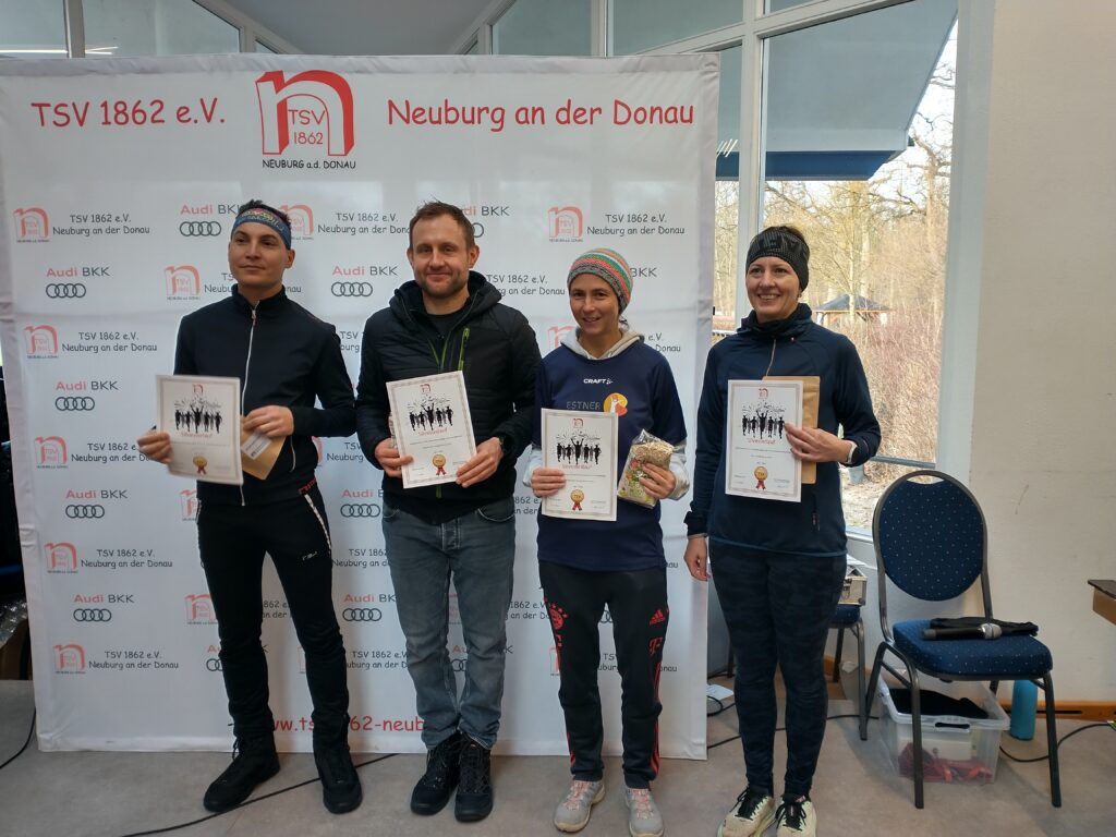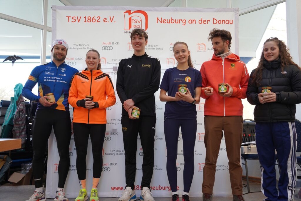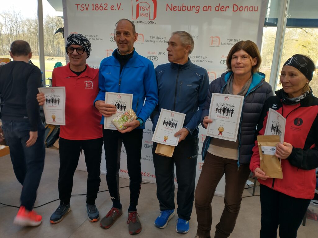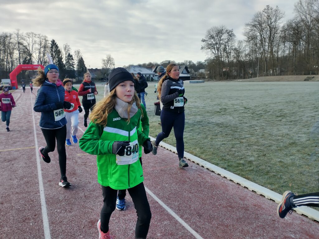 Oberbürgermeister Dr. Bernhard Gmehling schoss dann pünktlich das Läuferfeld auf die Strecke zum letzten Mal in der Funktion des Stadtoberhauptes. Lange Zeit bildete ein Quartett um Moritz Gutowski (LG Stadtwerke München), Basti Glockshuber (TSV Neuburg), Johannes Stahr (TSV Gaimersheim) und Luca Schreitmüller (TSV Harburg) die Spitze, aus der sich dann der 18jährige Gutowski als Vorjahressieger nach drei gelaufenen Kilometern mit einer Zeit von 19.04 Minuten gegen Glockshuber (19.22 Minuten), Stahr (19.37 Minuten) und den 17jährigen Schreitmüller (19.47 Minuten) durchsetzen konnte. Unser Vinzenz Fortner konnte die ersten zwei Kilometer bei der Männerspitze mithalten, dann musste der Mittelstreckenspezialist das Tempo etwas herausnehmen. Bei den Frauen war der Weg frei für die 16jährige Anita Blersch (21.56 Minuten, TSV Brannenburg), die auf Cross- und Hindernisstrecken zuhause ist, vor der 18jährigen Cosima Adam (22.47 Minuten) und Vorjahressiegerin Anna Liepold (22.54 Minuten, SC Irgertsheim). Wie im Vorjahr dominiert mittlerweile die Jugend das Geschehen, denn bei der Frauen- und Männerspitze mischen immerhin vier leistungsstarke Läufer mit. So muss es sein. Unisono kommentierten die Sieger die Veranstaltung mit „es hat Spaß gemacht“ und „ein guter Jahresabschluss“.