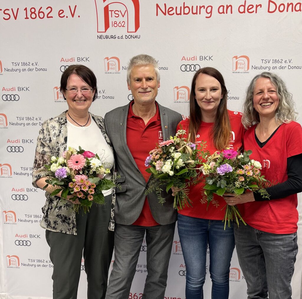 In der Mitte sehen wir jeweils die alten und neuen Funktionäre des TSV 1862 Neuburg e.V.. Namentlich von links: Frau Cornelia Euringer-Klose (seit 17.04.2026 1. Vorstand); Udo Kotzur, ehemaliger 1. Vorstand (von 2004 bis 2025); Maria Utschig Leitung Finanzen (seit dem 17.04.2026) neben Corinna Schuber, die das Amt Leitung Finanzen seit 2019 inne hatte.
