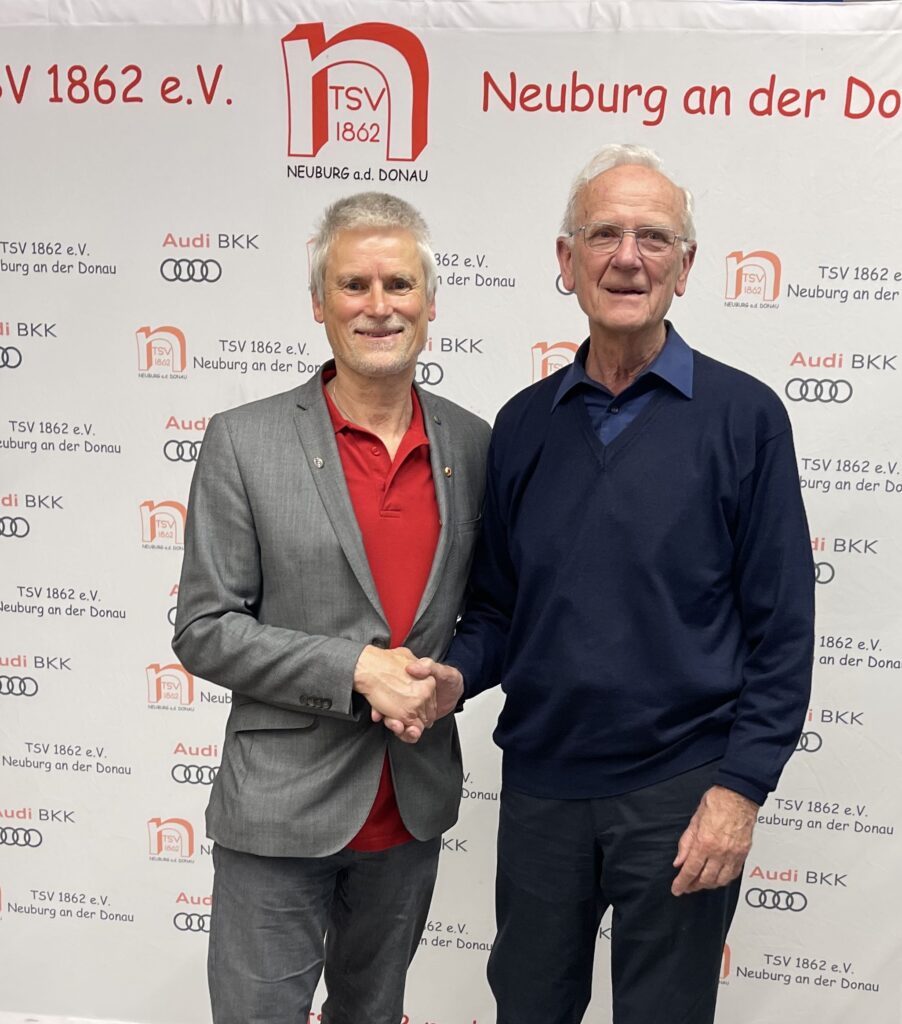 Auf dem linken Bild sehen wir unseren ehemaligen 1. Vorstand, Herrn Udo Kotzur, von 2004 – 2025 zusammen mit Herrn Herwig Wanzl, ehemaliger 1. Vorstand von 1983 – 2002. Das sind unsere beiden Ehrenvorsitzenden des TSV 1862 Neuburg e.V..