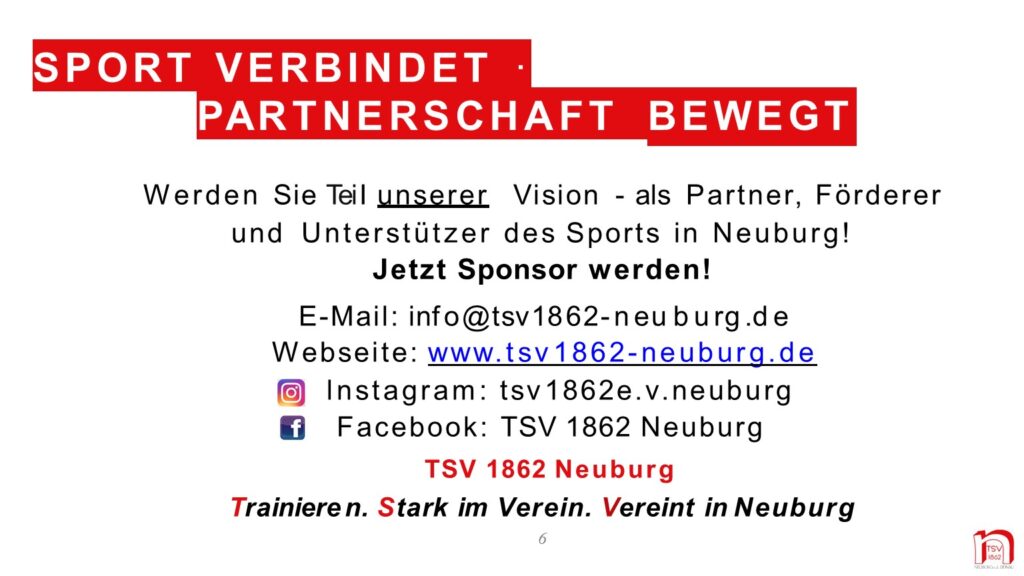 Der TSV 1862 Neuburg e.V. ist ein vielseitiger Sportverein mit Abteilungen und Teams auf Top-Niveau. Wir bieten verschiedene Sportarten und dadurch entstehende Präsentationsmöglichkeiten bei nationalen und internationalen Wettkämpfen an. Daraus ergeben sich für Sie interessante Optionen für ein Sponsoring. Durch individuell angepasste Pakete können Unternehmen auch mit einem kleinen Budgetrahmen eine ausdrucksstarke Präsenz und Kommunikation für ihre Marke erzielen.
